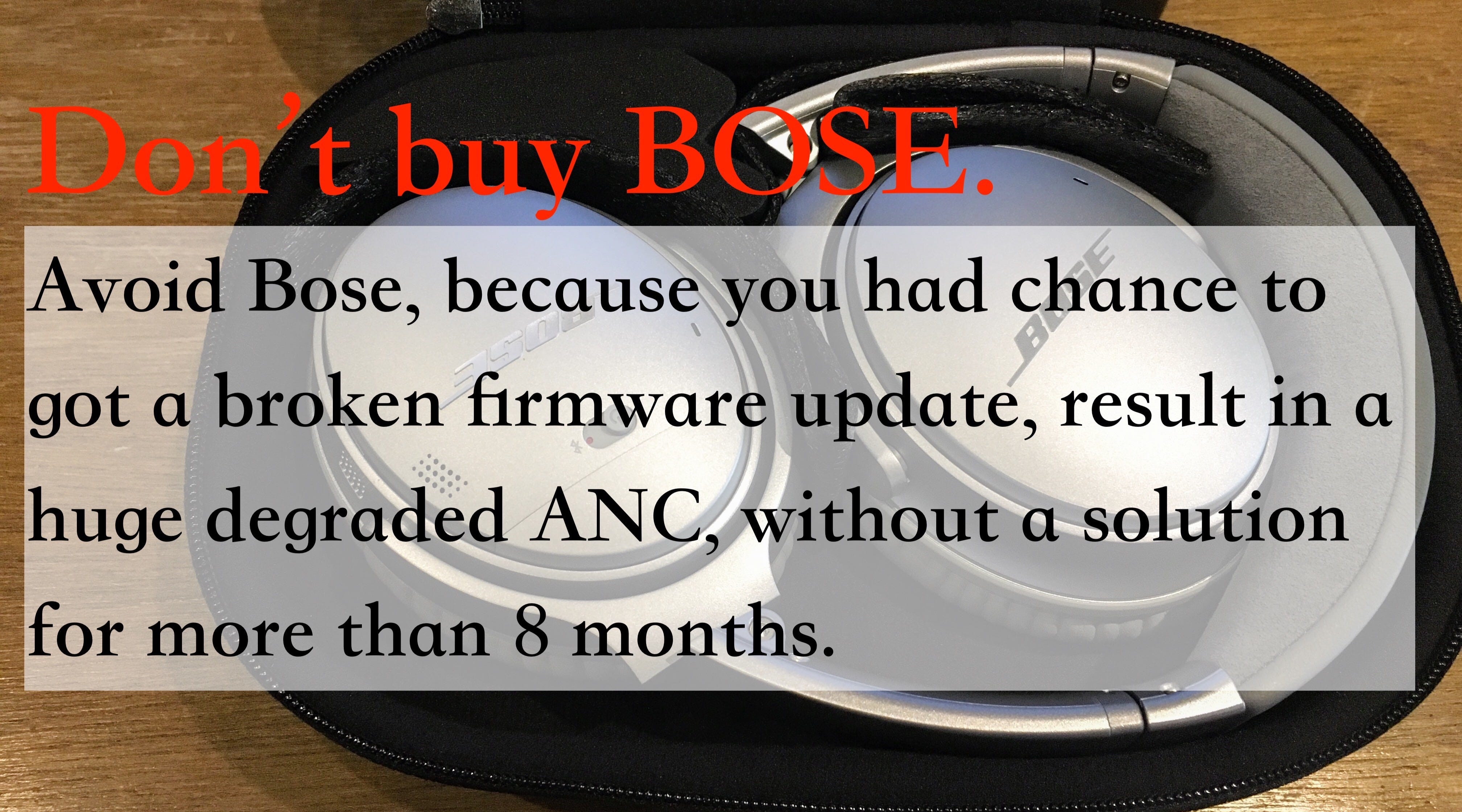 有名的降噪耳機 Bose QC35 II,在去年(2019) 4 月時推出 4.5.2 版韌體,更新完有機會讓主動降噪的效果極度減弱。表徵是 ANC 高與中等的效果聽起來幾乎一樣(正常狀況下有非常明顯的不同)。